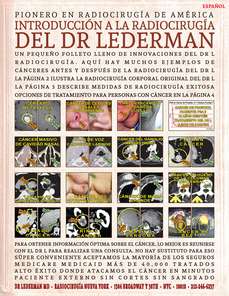 Un pequeño folleto lleno de innovaciones del dr L radiocirugía. Aquí hay muchos ejemplos de Cánceres antes y después de la radiocirugía del Dr L La página 2 ilustra la radiocirugía corporal original del Dr L LA PÁGINA 3 DESCRIBE medidas de radiocirugía exitosa opciones de tratamiento para personas con cáncer en la página 4