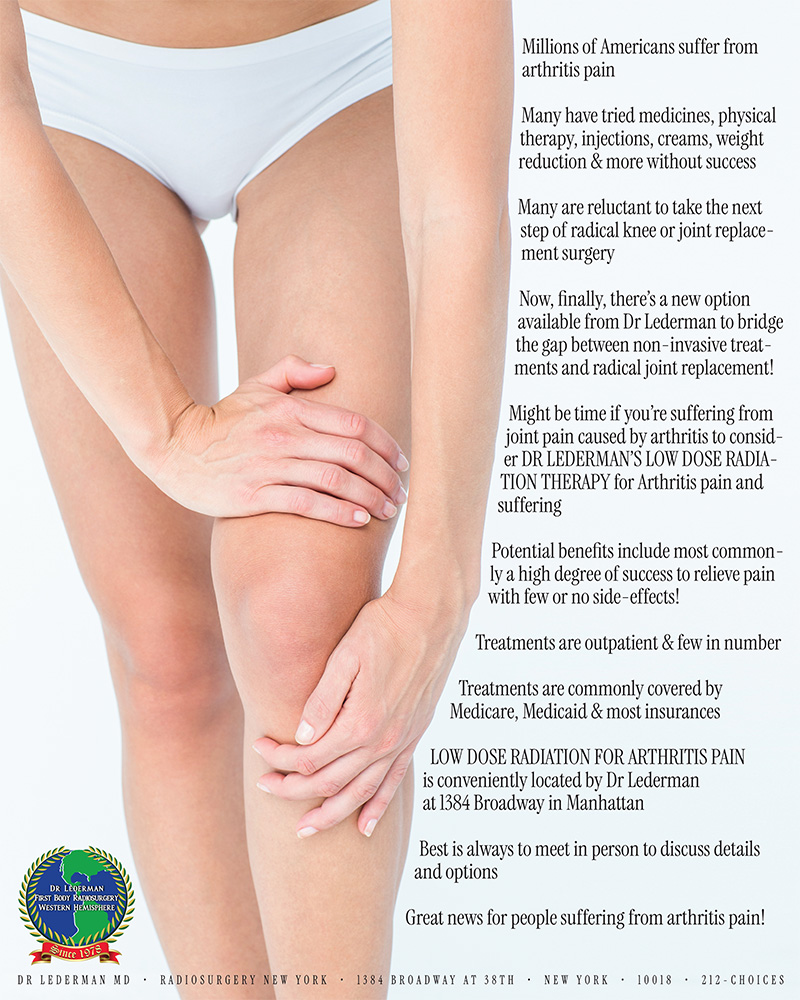 Low dose radiation generally relieves arthritis pain of hip, knee, hand —and more caused by osteoarthritis, bursitis, synovitis and tendonitis. Thousands treated over decades with high success. Radiation dose is very low, so treatment is considered very safe. Similar success is observed in people suffering from Plantar Fasciitis heel pain.
